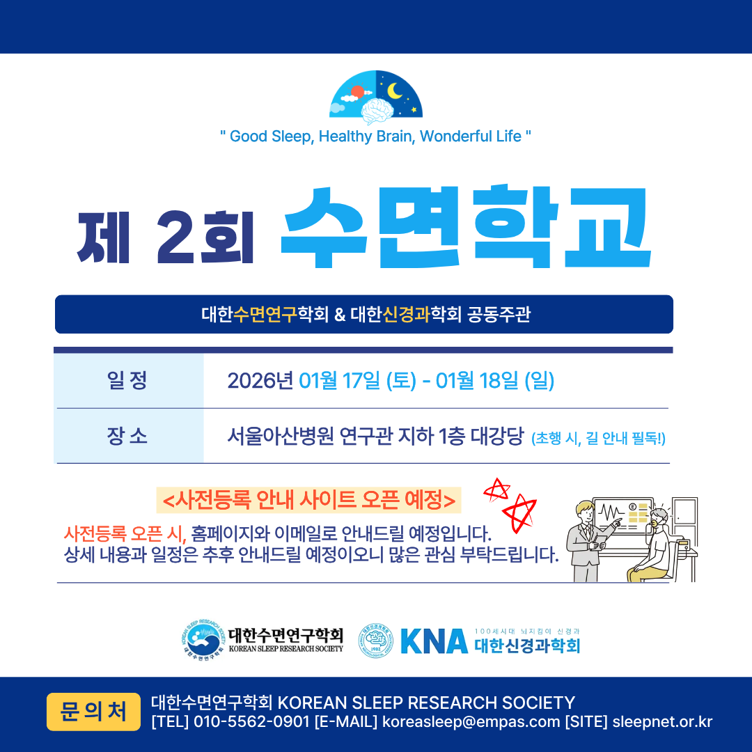 대한수면연구학회 & 대한신경과학회에서 공동 주관하는「제2회 수면학교」가 아래와 같이 개최될 예정입니다. 사전등록 사이트는 오픈 시 홈페이지와 이메일을 통해 안내드릴 예정입니다. 자세한 일정은 추후 공지드릴 예정이오니 많은 관심 부탁드립니다. < 행사 개요 > ■ 행사명: 제 2회 수면학교 ■ 공동 주관: 대한수면연구학회, 대한신경과학회 ■ 일 시: 2026년 1월 17일(토) ~ 1월 18일(일) ■ 장 소: 서울아산병원 연구관 지하 1층 대강당 사전등록 오픈 시 홈피 및 전체 회원님들께 메일로 공지드릴 예정이니 회원 여러분의 많은 관심과 참여를 부탁드립니다. 감사합니다. 대한수면연구학회 사무국 드림. ![]() |