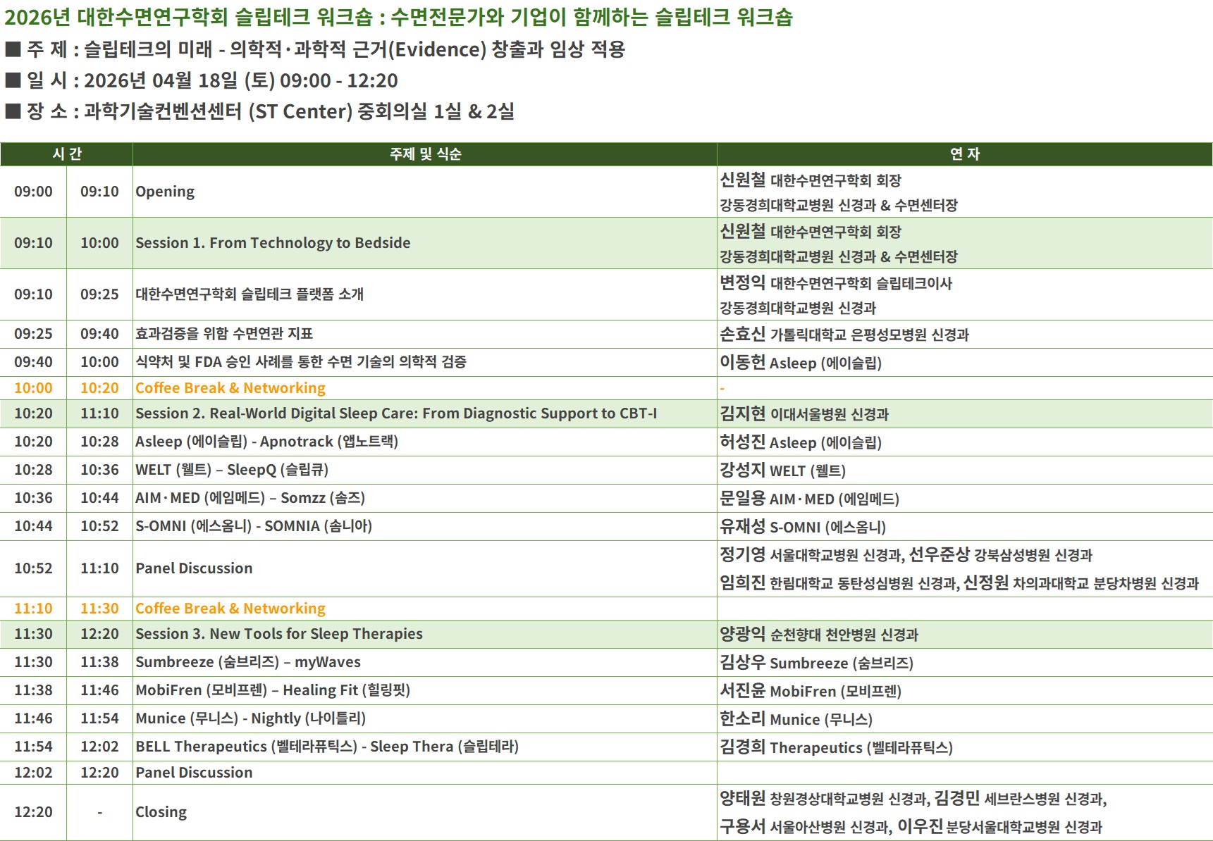 | (예정) 2026년 대한수면연구학회 슬립테크 워크숍 : 수면전문가와 기업이 함께하는 슬립테크 워크숍 | |