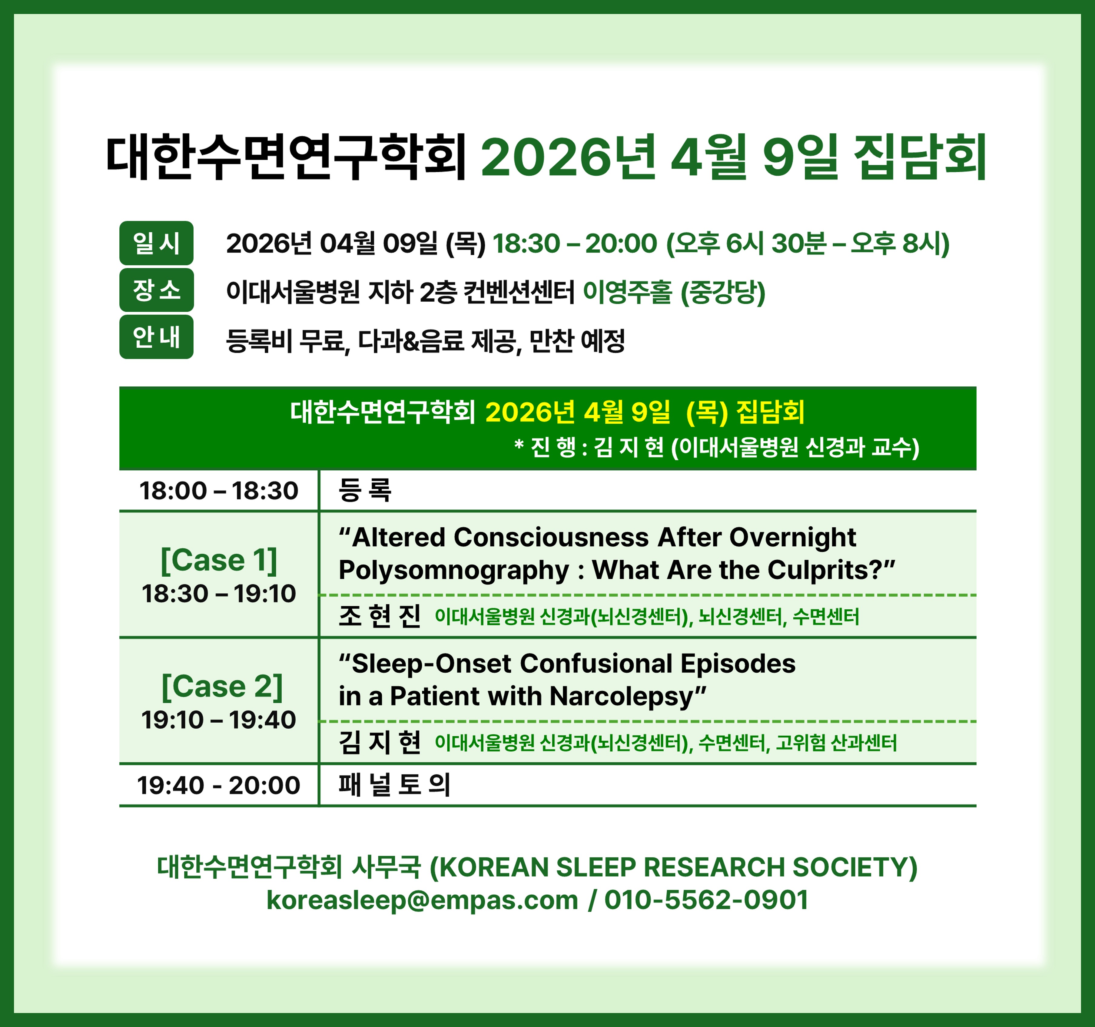 | 대한수면연구학회 2026년 4월 9일 (목) 집담회 (이대서울병원) | |