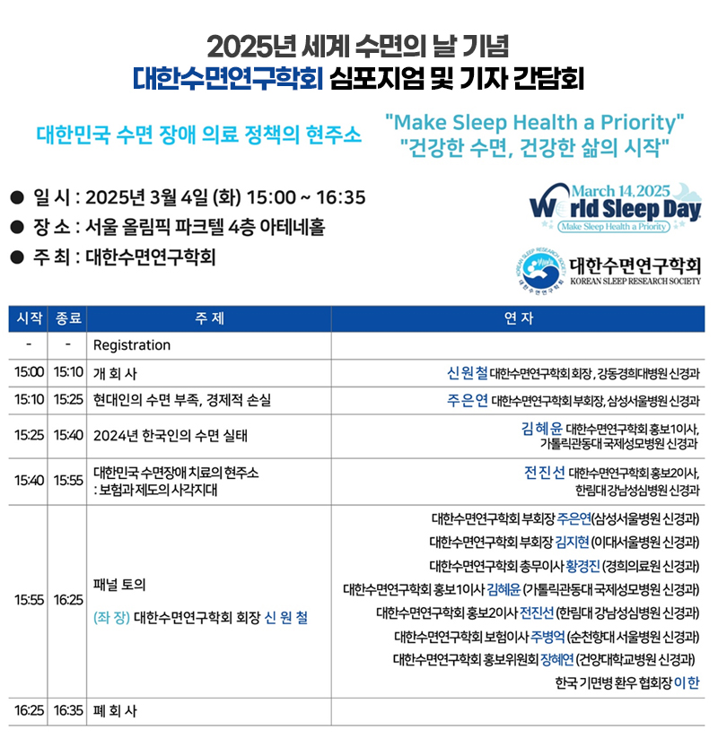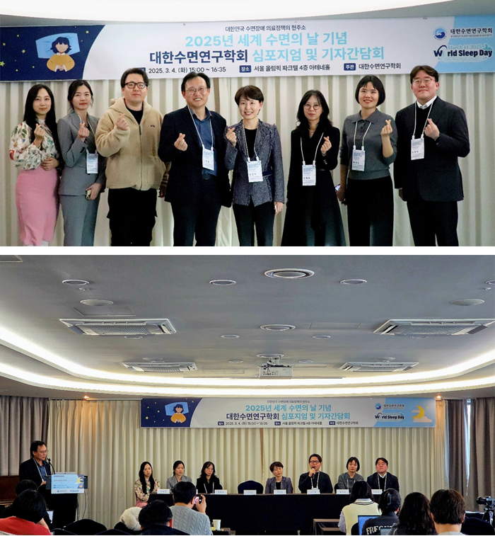 대한수면연구학회는 세계 수면의 날을 맞아 3월 4일에 올림픽파크텔에서 ‘건강한 수면, 건강한 삶의 시작’ 이라는 주제로 심포지엄 및 미디어 간담회를 열었습니다. ‘현대인의 수면부족, 경제적손실’, ‘2024 한국인의 수면 실태’, ‘대한민국 수면장애 치료의 현주소’에 대해 각각 주은연 교수(성균관대 신경과), 김혜윤 교수(가톨릭관동대 신경과), 전진선 교수(한림대 신경과)가 발표하고 패널토의를 진행하였습니다.