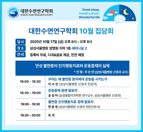 <대한수면연구학회 집담회 > - 주 제 : 2025년도 대한수면연구학회 10월 집담회 - 일 시 : 2025년 10월 17일 (금) 18:00 –